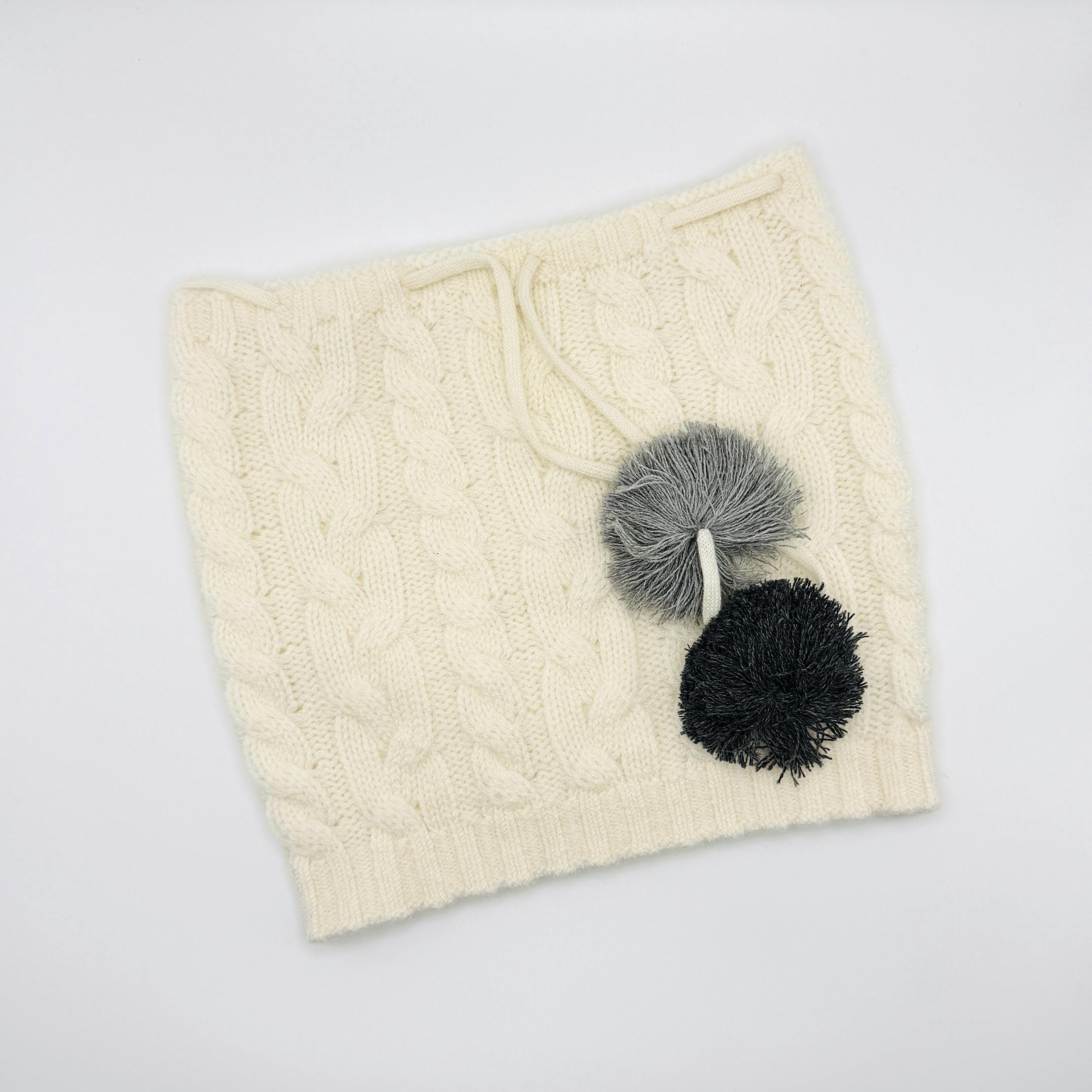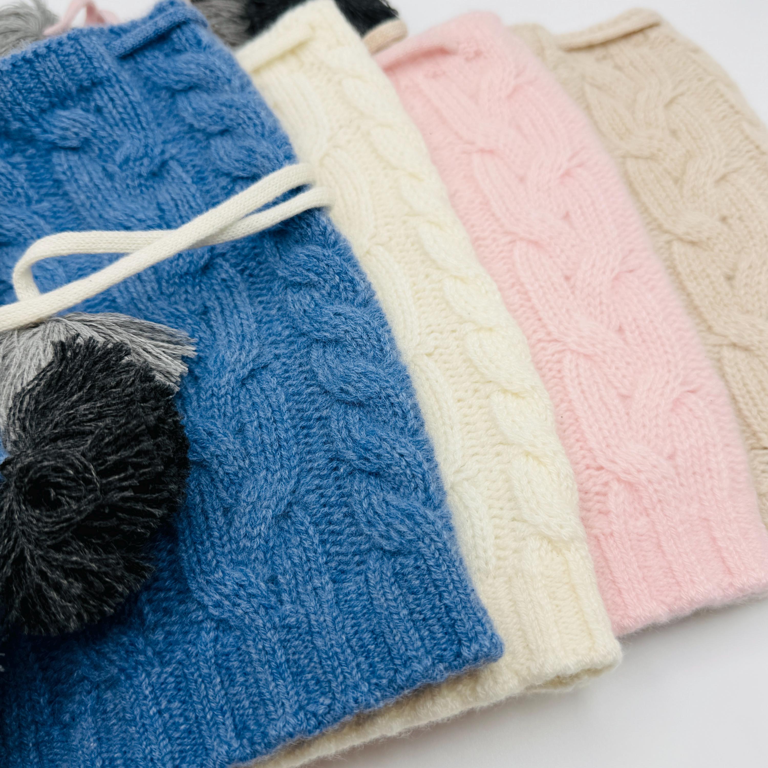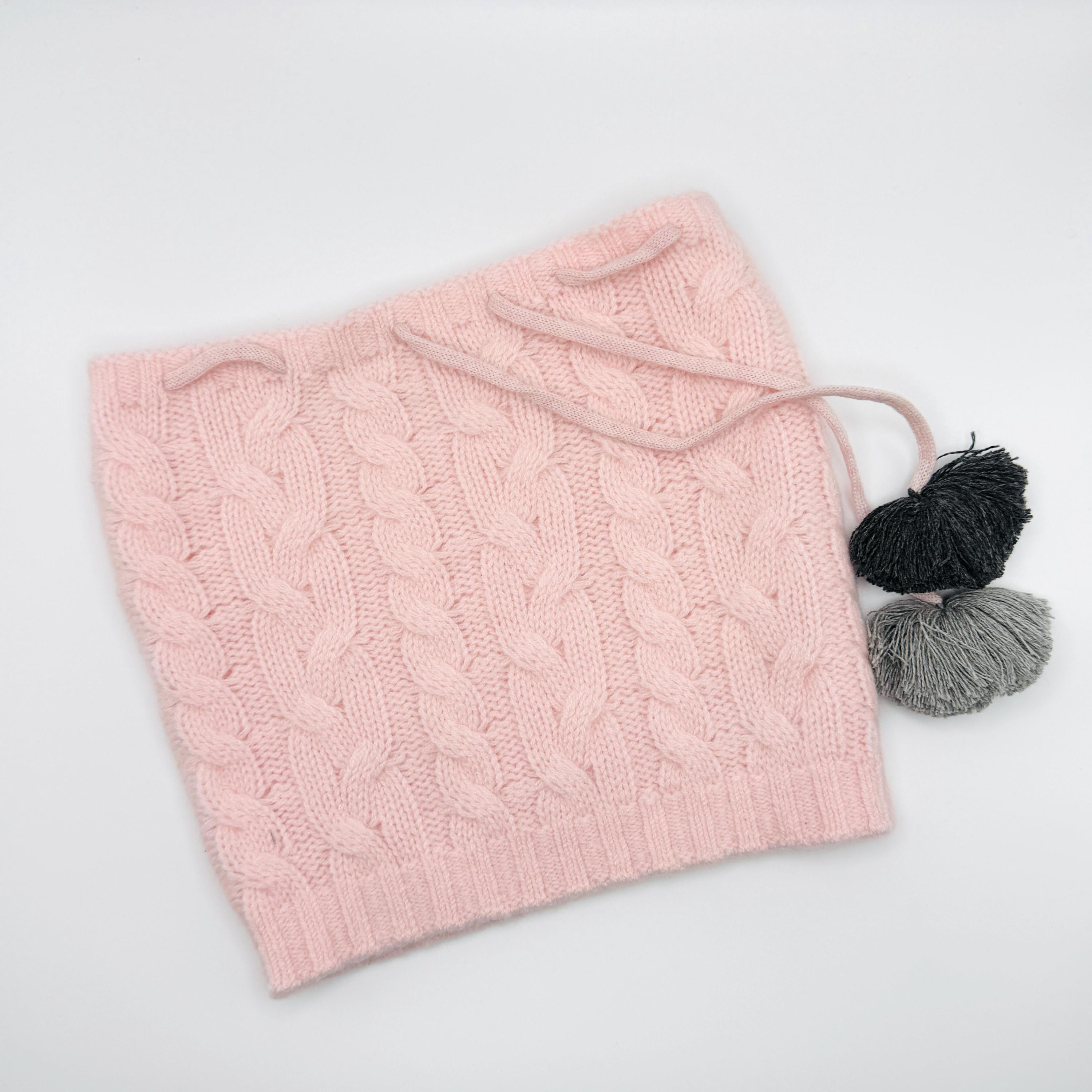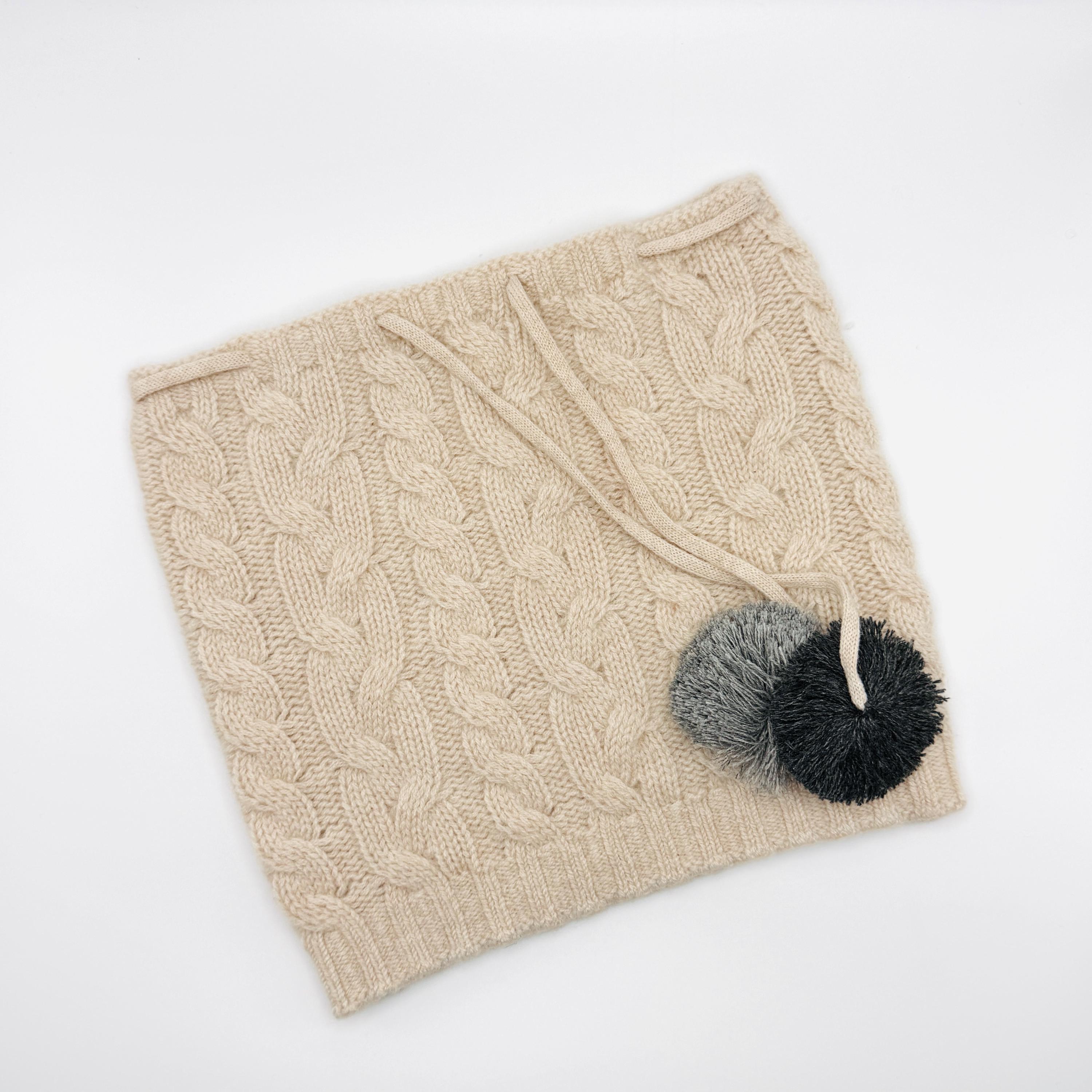 Crafted from ultra-soft 100% cashmere, this luxurious cable-knit snood doubles as both a cosy neck warmer and a stylish hat. Designed for comfort and versatility, it features a soft drawstring top with fluffy pom pom accents and can be easily adjusted to suit your style and warmth needs.