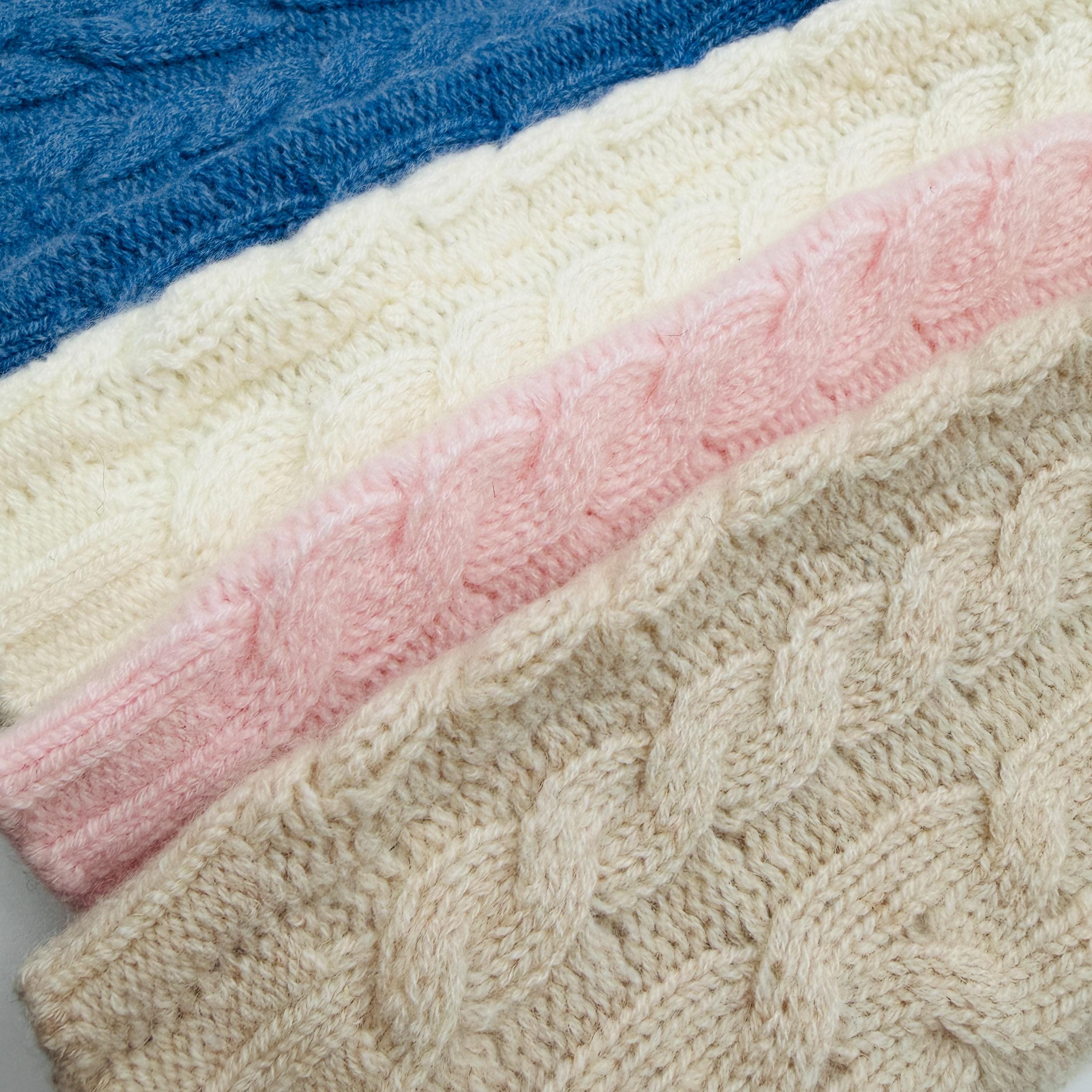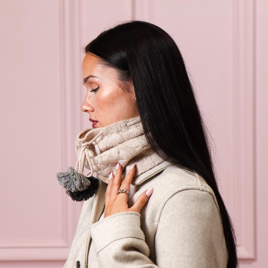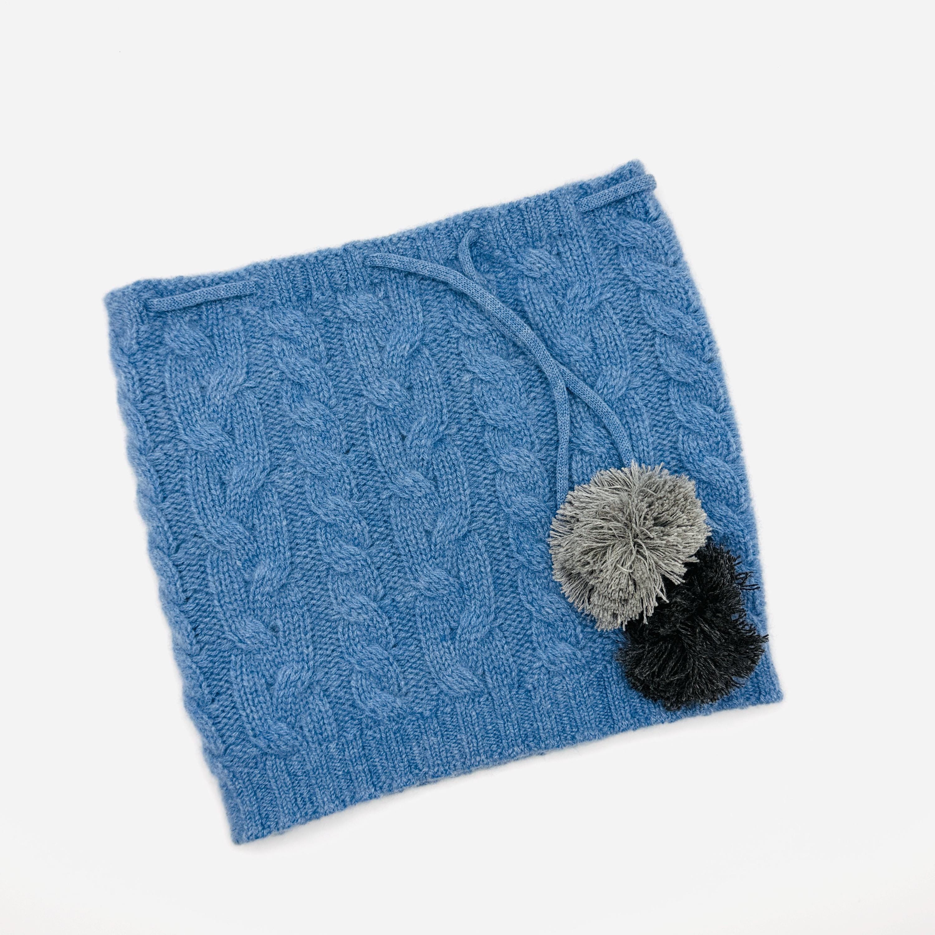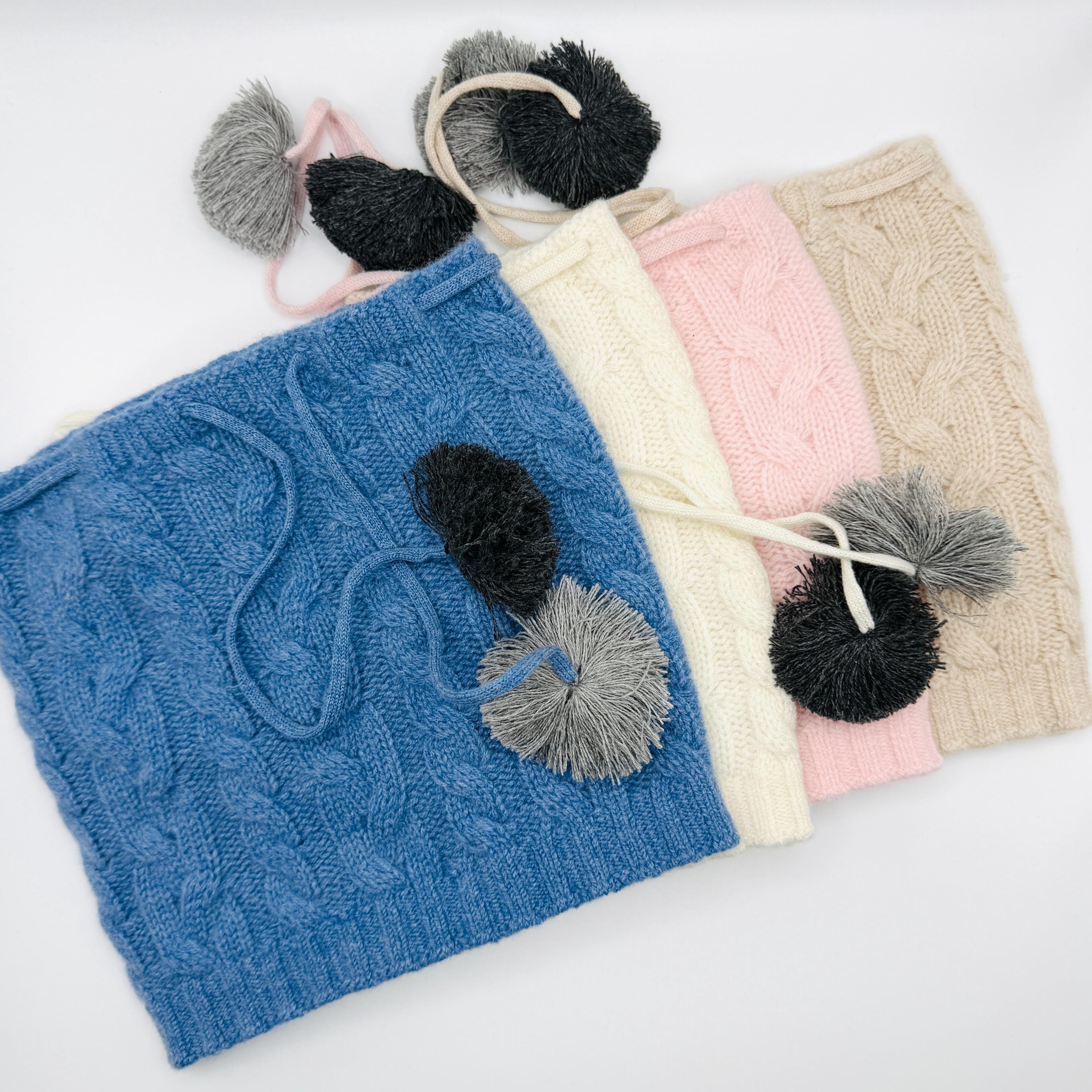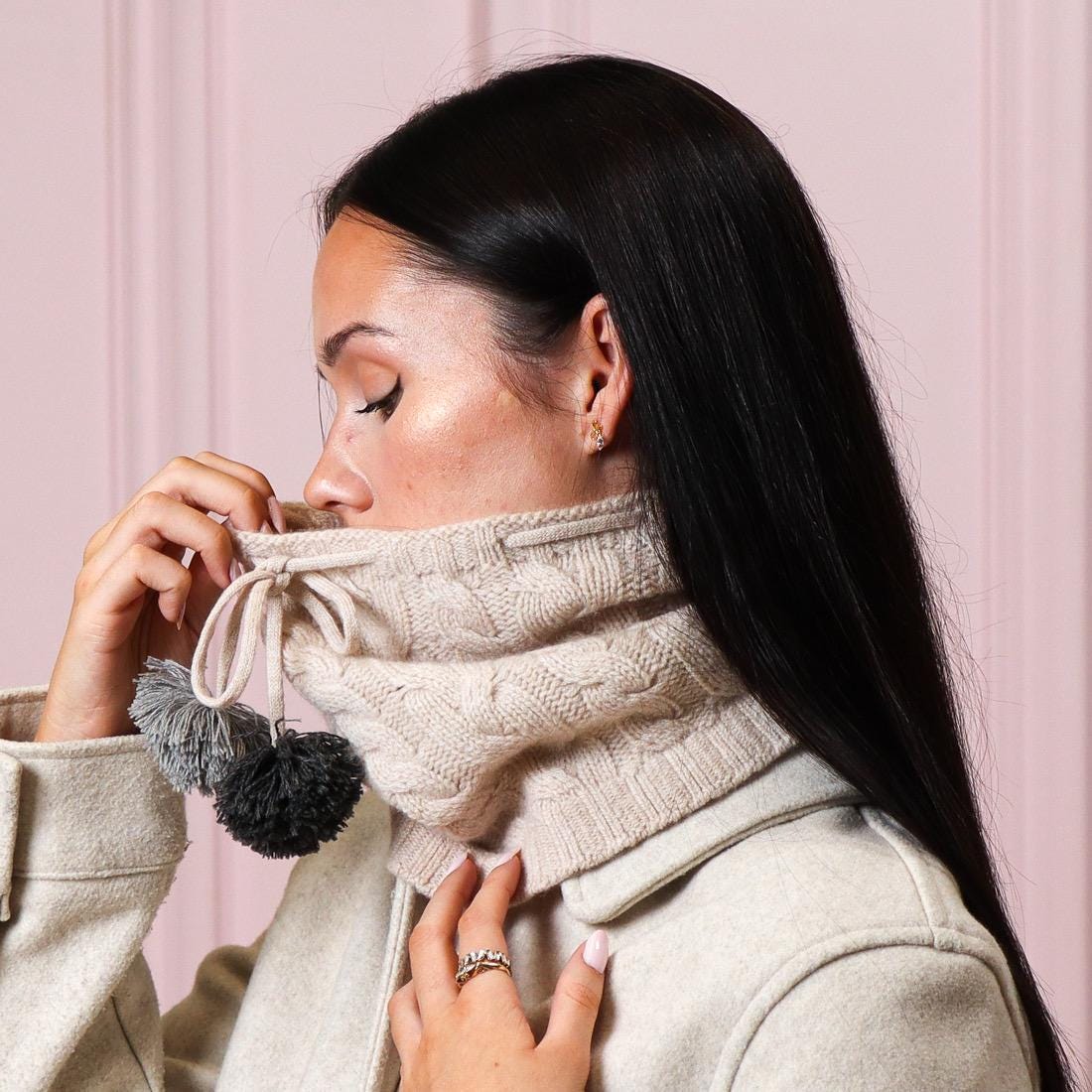 Crafted from ultra-soft 100% cashmere, this luxurious cable-knit snood doubles as both a cosy neck warmer and a stylish hat. Designed for comfort and versatility, it features a soft drawstring top with fluffy pom pom accents and can be easily adjusted to suit your style and warmth needs.