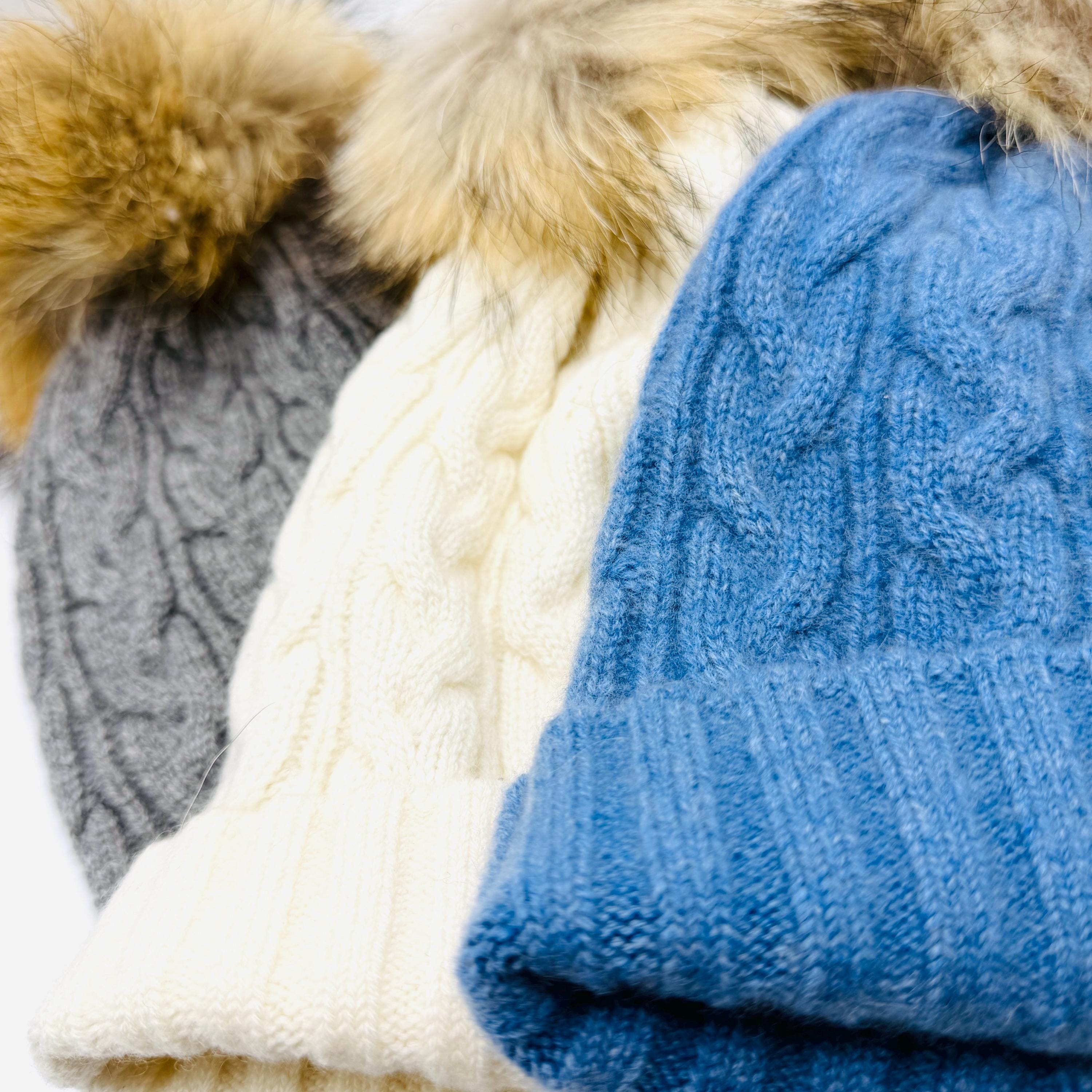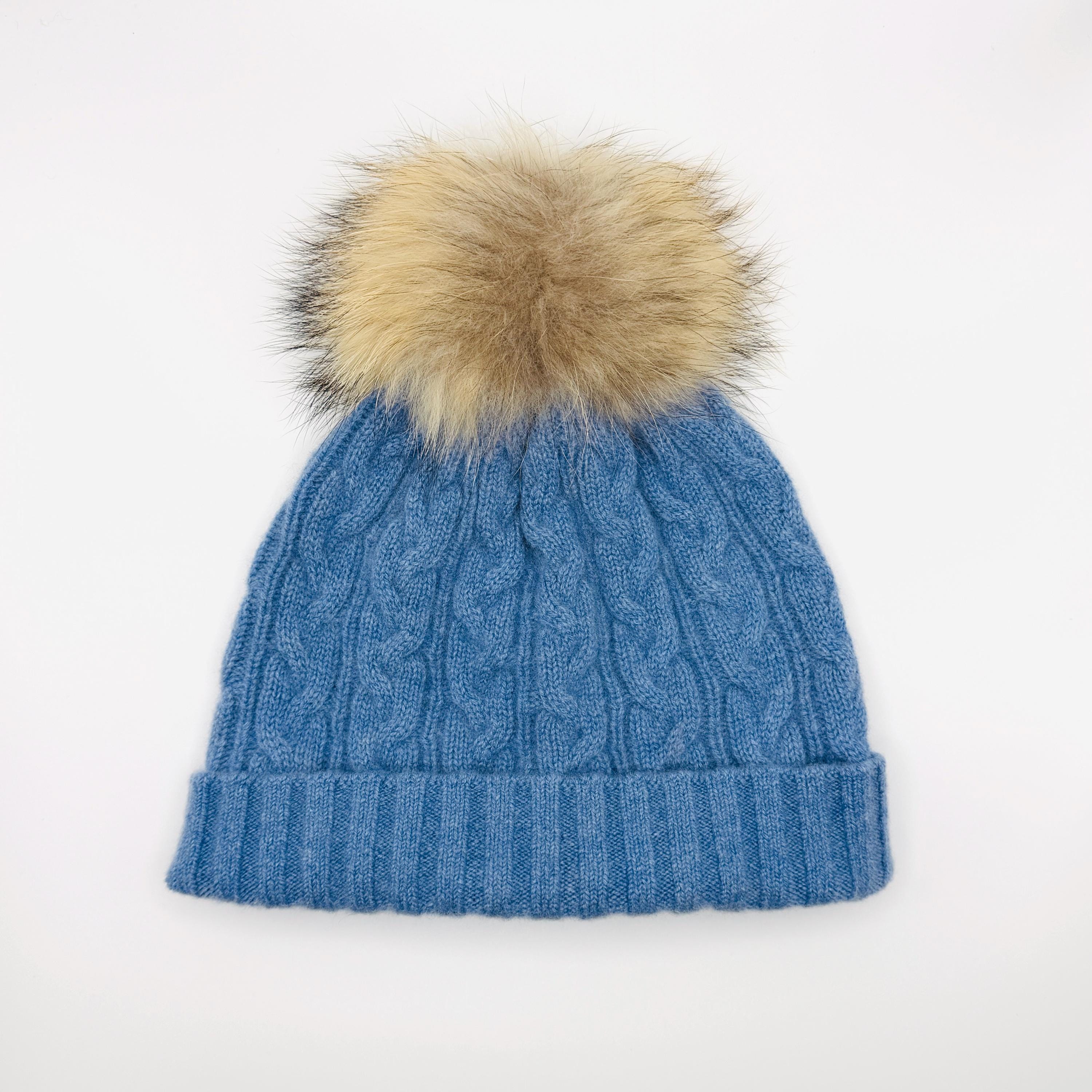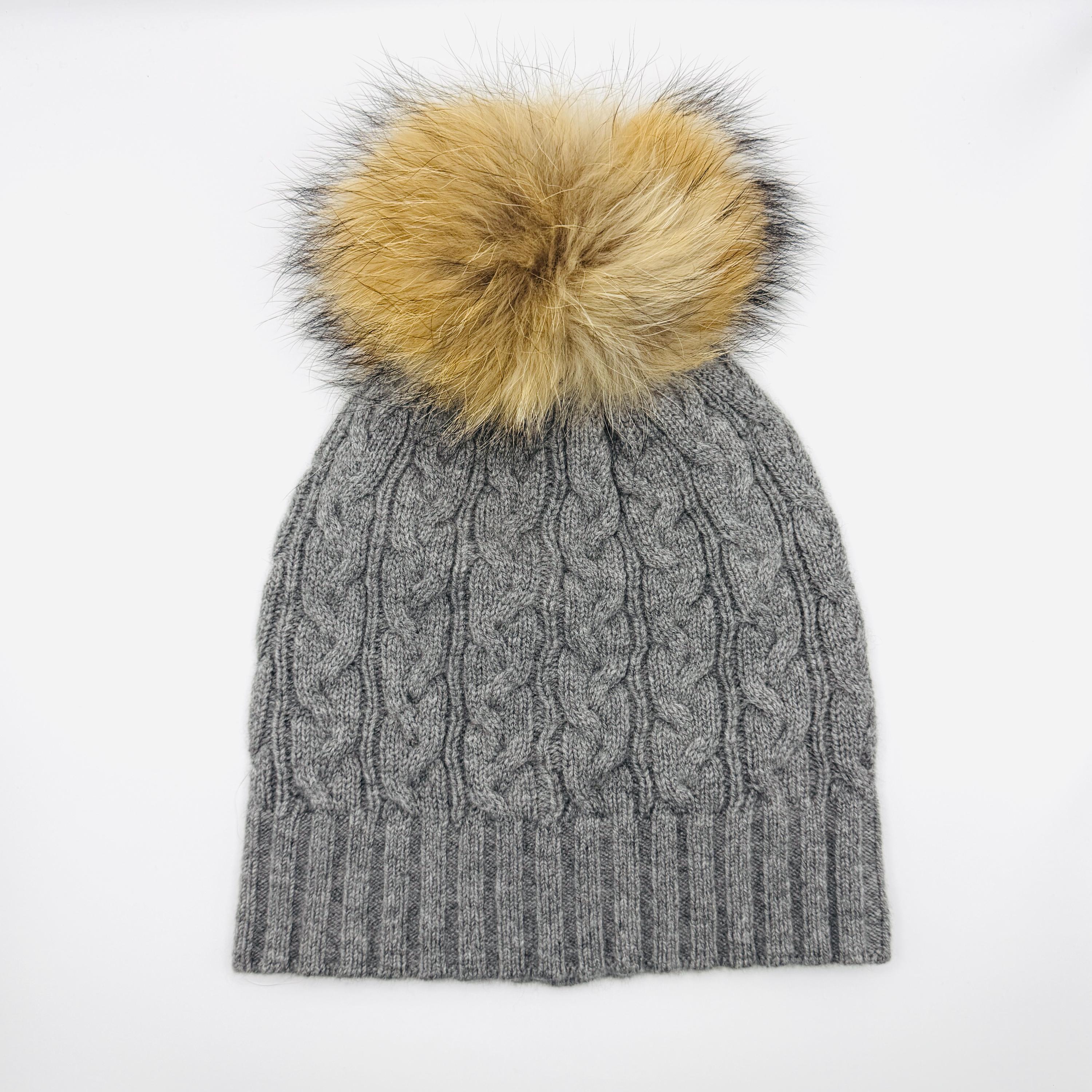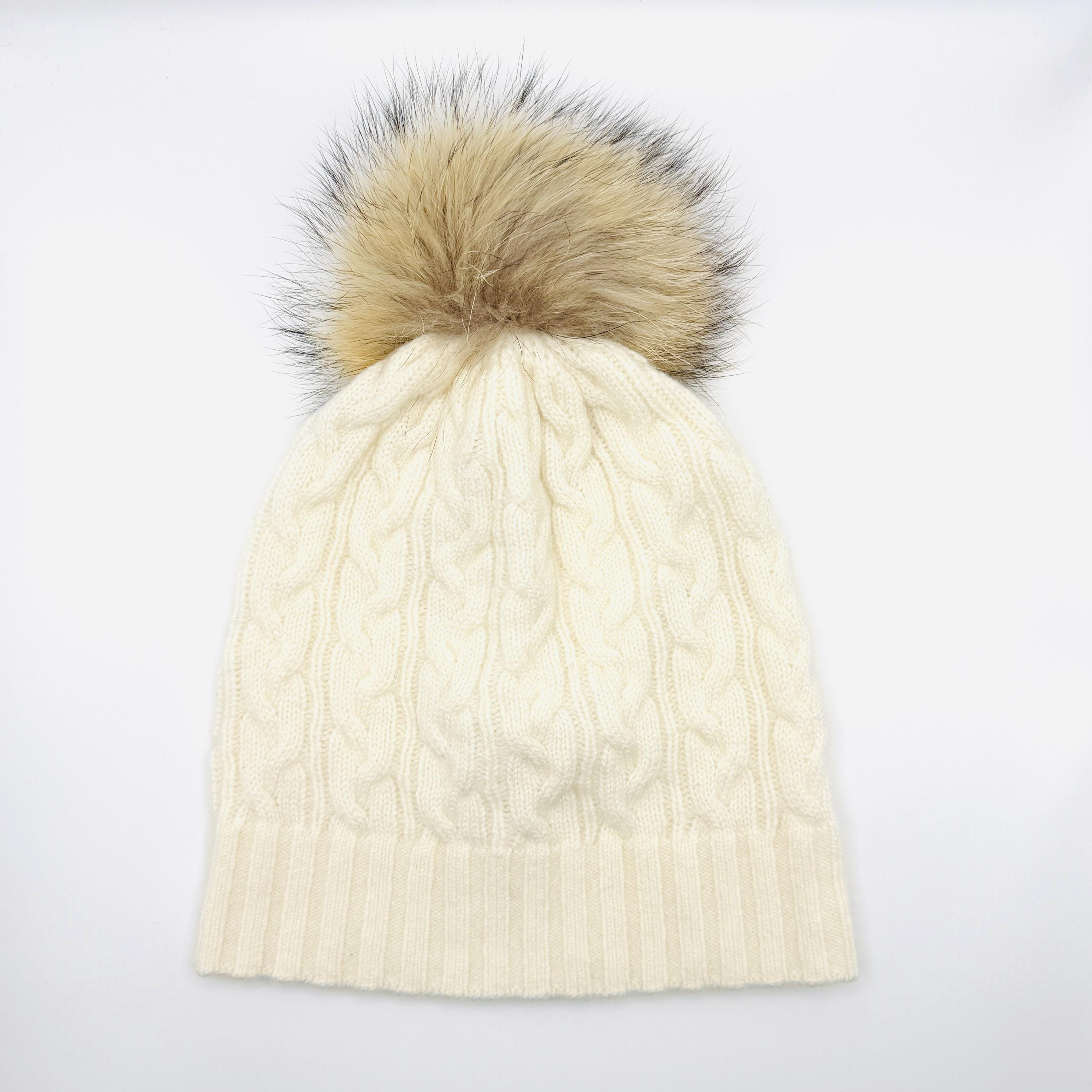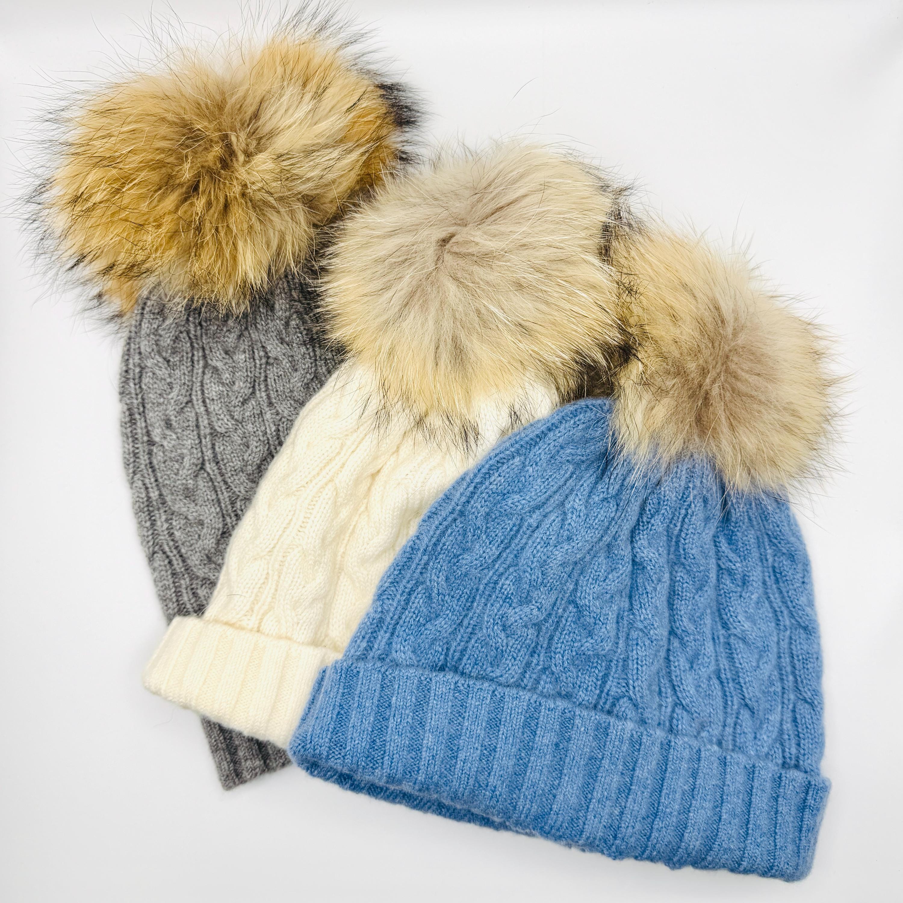 100% Cashmere Beanie with Detachable Fur Pom Pom – Soft Cable Knit Winter Hat – Luxury Women’s Cold Weather Gift